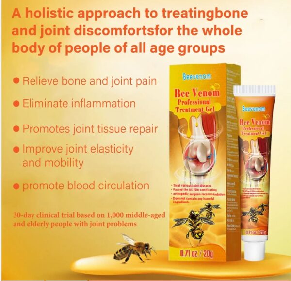 On September 16, 2022, a scientific study conducted at a leading Los Angeles hospital revealed the significant effectiveness of Bee Venom Joint Therapy Pain Relief Gel in treating bone disorders. The study, which involved patients with various orthopedic conditions, demonstrated that our gel successfully reduced pain, stiffness, and inflammation within just three weeks of use. Furthermore, the study showed that the gel significantly improved overall joint and bone health, further solidifying its reputation as a trusted solution for joint and bone issues.